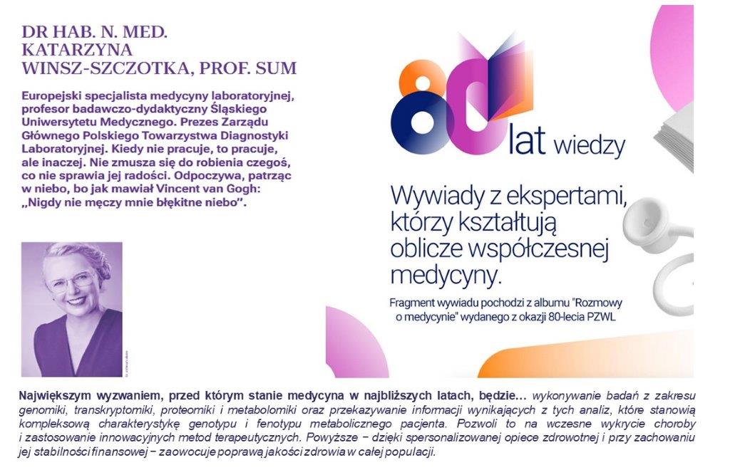 Wywiad z Panią Profesor Śląskiego Uniwersytetu Medycznego Katarzyną Winsz-Szczotką, z Zakładu Laboratoryjnej Medycyny Praktycznej Wydziału Nauk Farmaceutycznych w Sosnowcu, Prezesem Polskiego Towarzystwa Diagnostyki Laboratoryjnej, został opublikowany w jubileuszowym albumie „Rozmowy o medycynie”, wydanym z okazji 80-lecia działalności Państwowego Zakładu Wydawnictw Lekarskich (PZWL), który od 1945 roku wspiera rozwój polskiego środowiska medycznego.